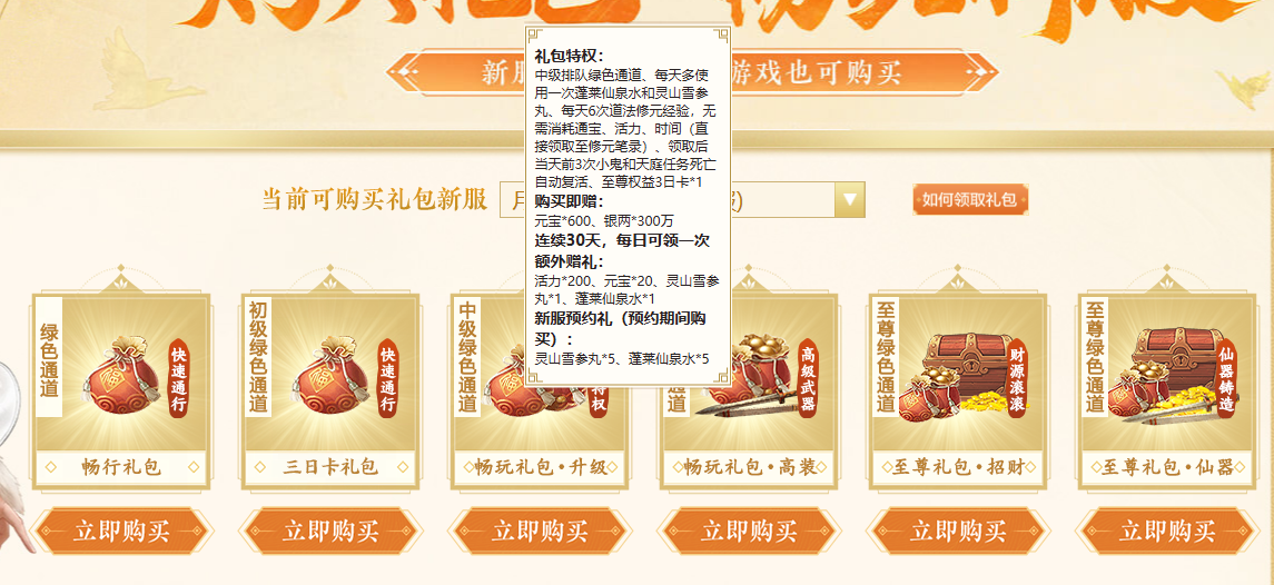 开服前可通过礼包页>>登录游戏账号,畅享绿色通道,进入游戏免排队。平民玩家可以购买冲级特权礼包,礼包送的银两和元宝价值差不多有60元了,还送三日卡,每天领取的经验加倍药水可以让我们在新区快速升级。当然其他礼包也是可以叠加购买的。
