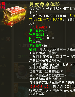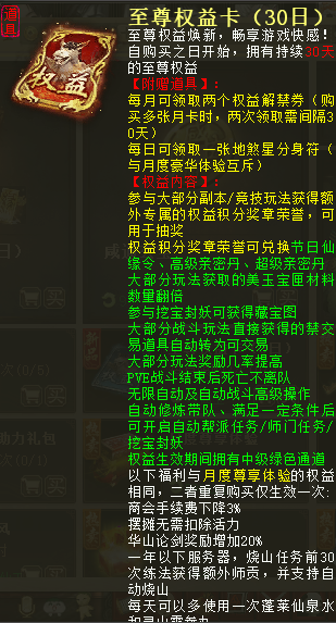2.月卡(至尊权益):能开还是开吧,不乱造是亏不了的,90块的至尊权益卡酒店小二的强盗任务会给宝图,挖宝可以获得灵兽宝箱、绮罗宝箱以及元宝和众多游戏中的珍贵道具。而且装备评分不够的情况下,同样可以获得积分及奖章。60块的月度尊享体验,每天可以领取师贡,经验加倍药品,最主要的是新区开区有免单的几率,有需要的兄弟可以开一下。