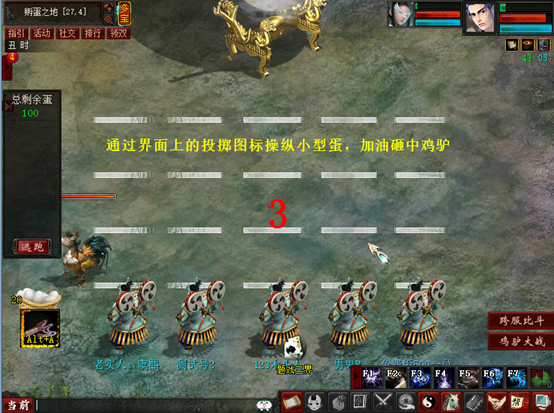 2当天首次战胜5波对手后,将被传送到“孵蛋之地”。全体队员进入封印状态,只能通过“ALT+A”控制技能,用蛋砸中鸡驴。随着鸡驴大神血量的减少,它会逐渐后退,直到飞天。当然,你们打退的也可能是只冒牌鸡精。