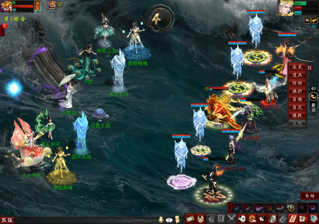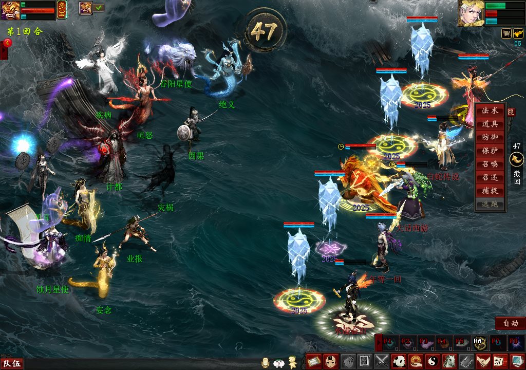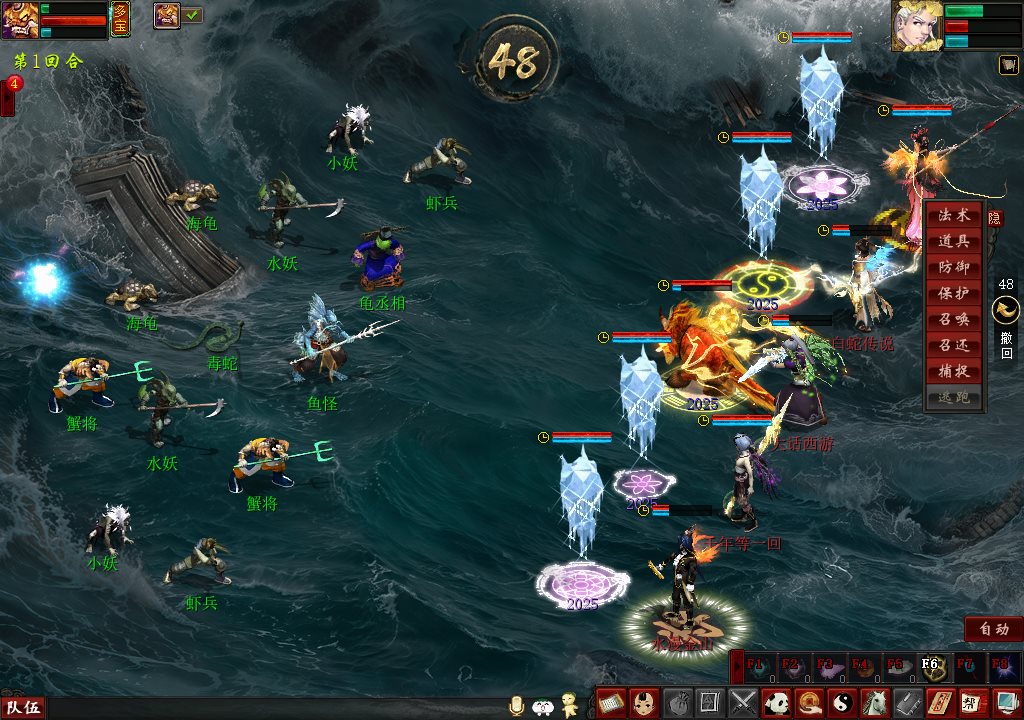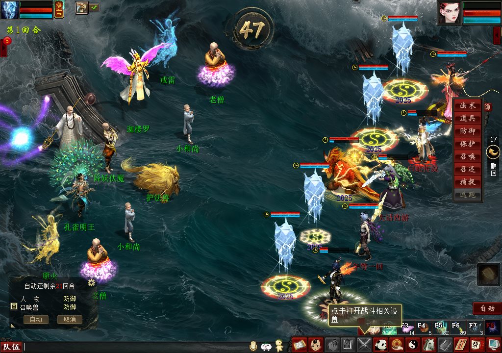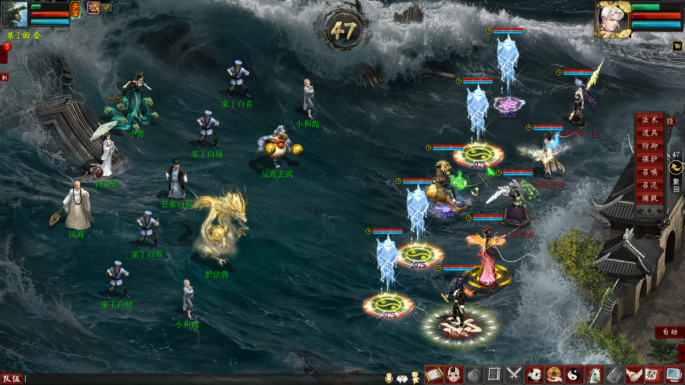 洪波之上,小青率妖众肆意叫嚣。需尽早将她击败,令其归束水妖,退兵离去。