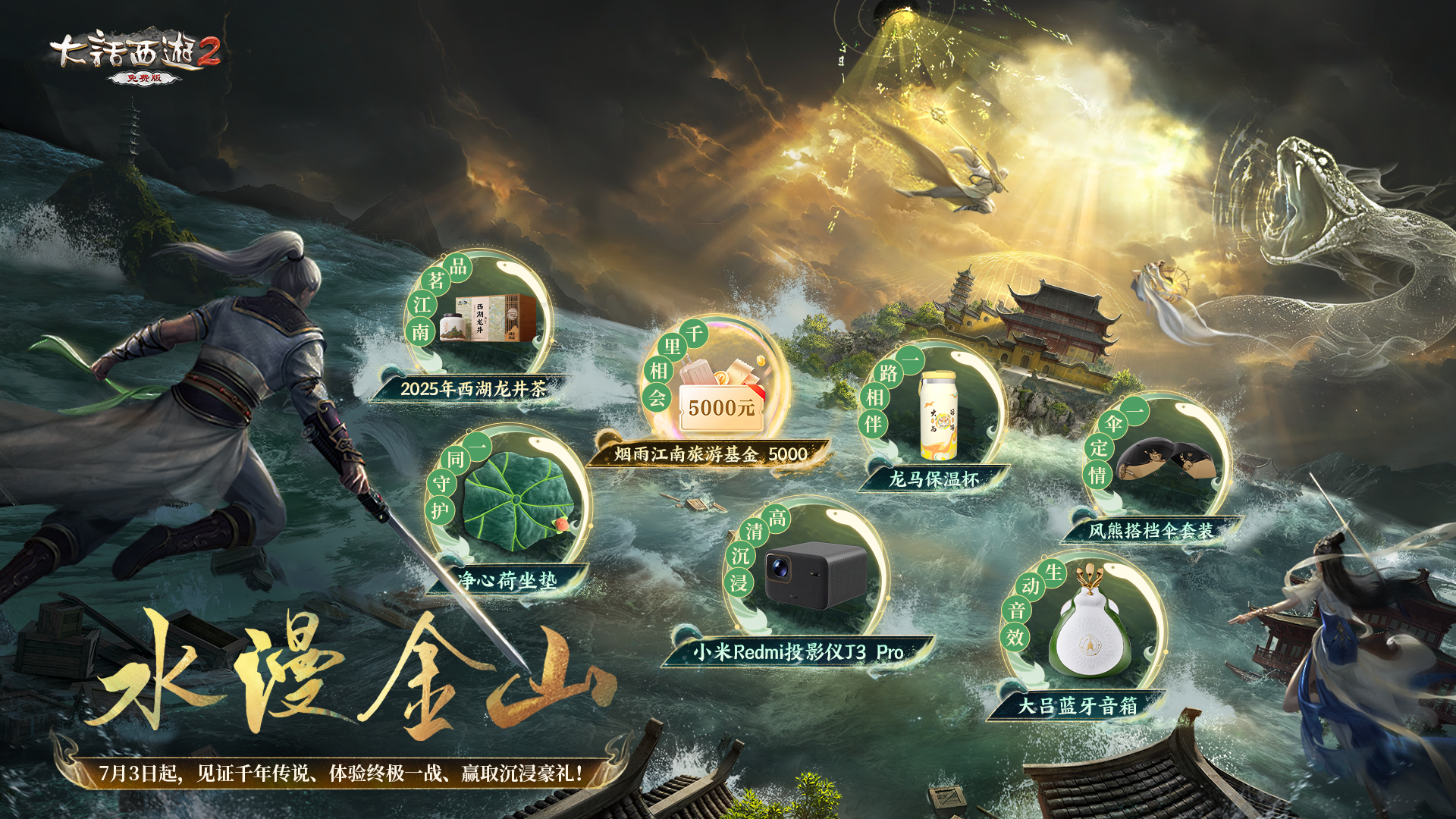 有机会抽取烟雨江南旅游基金5000元、大话西游乐神兽大吕蓝牙音箱、小米Redmi投影仪J3 Pro、龙池古井2025年西湖龙井茶、风熊搭档伞套装、大话西游龙马保温杯、大话西游净心荷坐垫等实物奖励,以及八荒遗风、聚魄丹、黄宝石、炽星石等珍稀道具。