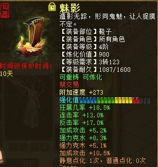 鞋子我选择了了纯敏鞋子而非传统的大力属性鞋子,因为敏对我来说不可缺少,鞋子上和帽子一样也是可以炼化出所有的大力属性,同样是建议双克叠加加大力属性为主。