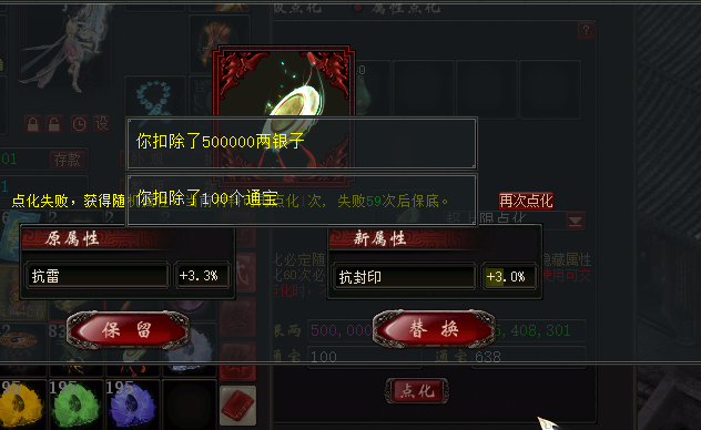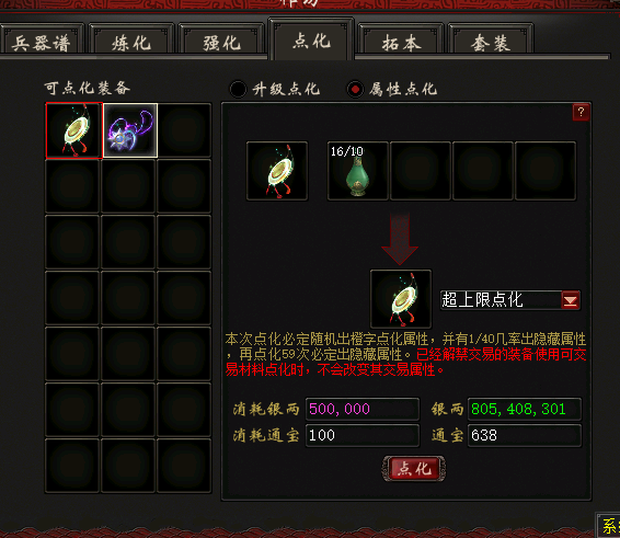 超上限点化必定随机出橙色点化属性,有1/40几率出隐藏属性,保底60次必出隐藏属性。每次点化需要:10个六合玉露+50万银两+100通宝。