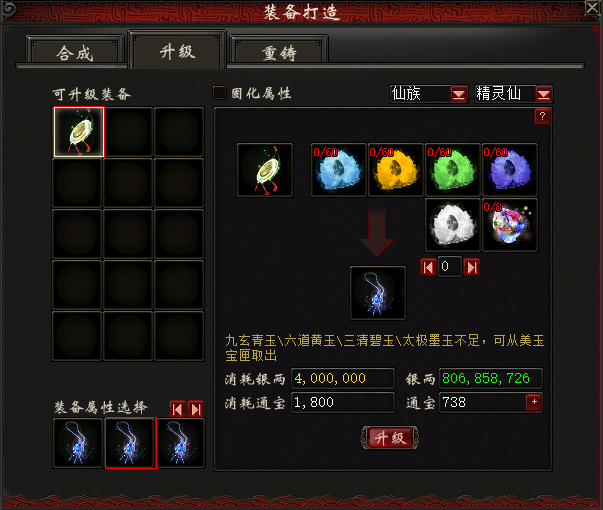 直接升级所需材料如下:60青玉+60黄玉+60碧玉+60墨玉+1800通宝(或72个白玉)+8个无量琉璃+400万银两。