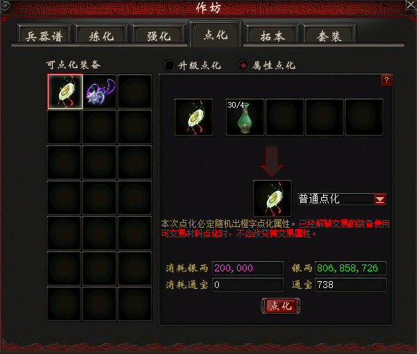 普通点化必出随机橙色点化属性。每次点化需要:4个六合玉露+20万银两。