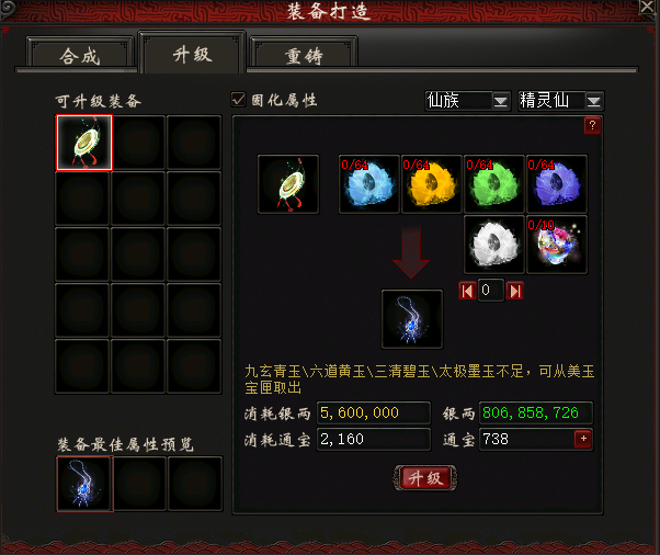 固化升级所需材料如下:4种玉各64个+2160通宝(或86.4个白玉)+10个无量琉璃+560万银两。