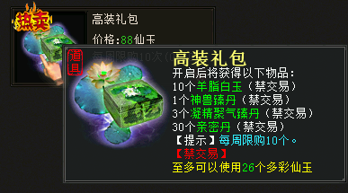 高装礼包的总价值。按照新区的点数应该是3W6等于1点,那么够买一个高装礼包就需要317W。 光是10个羊脂白玉的就等于350W了。然后神兽甄丹一个等于100W 3个聚气臻丹等于120W 30个亲密丹=80万 所以这个礼包相当于 650万,一般新手来说他不懂,他就会选择去购买羊脂白玉升级高装,这样就很不划算了,然后一个星期只可以买10次,所以慢慢培养合理去选择。