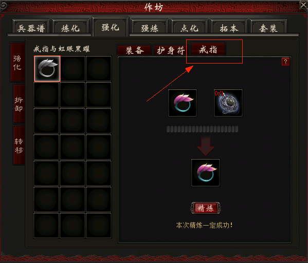 戒指的强化为精炼,需打开作坊,选择强化——戒指,打开精炼界面。