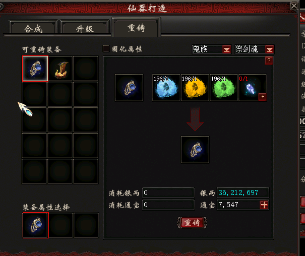 重铸需要青玉1+黄玉1+碧玉1+摇光宝珠1+80万银两。