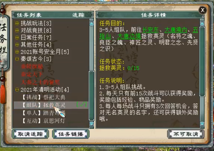 去大唐边境、长安东、五指山、大唐境内等地拯救英灵,常规节日小怪水平,无难度,活动期间每天可完成15次。战斗中根据前排三个小怪名字的提示猜出历史人物的名字,比如道家创始、无为而治是老子,答对有额外奖励。