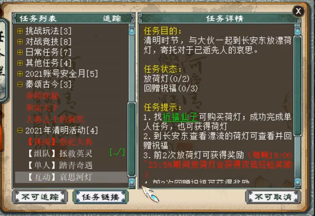 来到长安东(95,121)附近,点击物品栏里的荷灯,选择祝福语,完成任务。