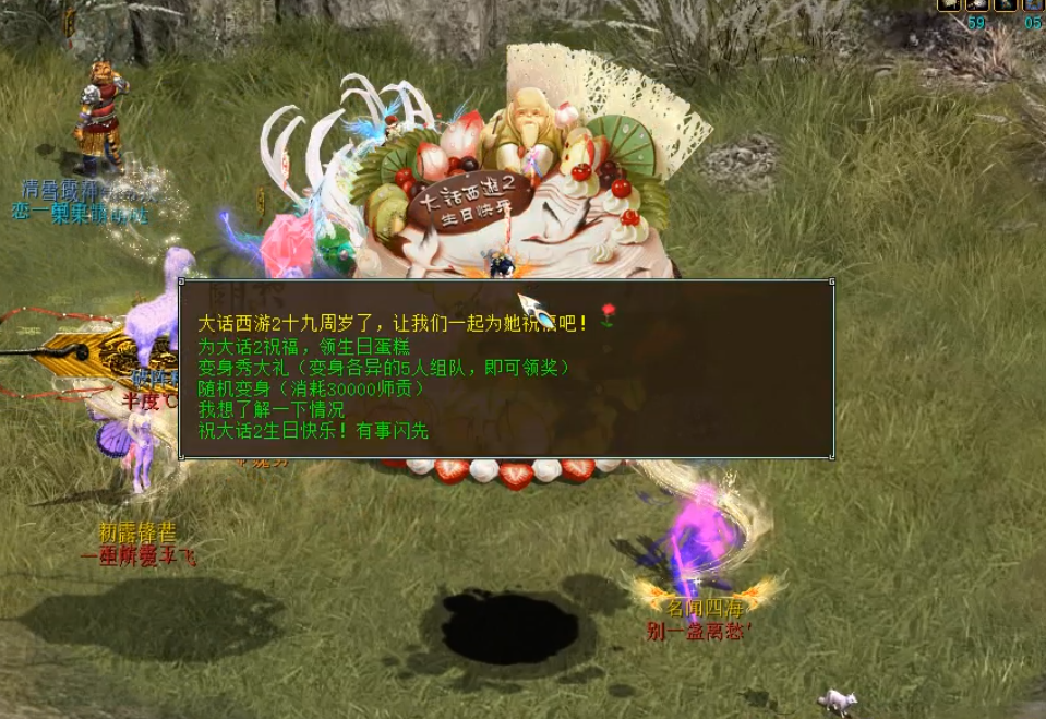 前往长安城东(113,200)找到十九周年巨型生日蛋糕,领取蛋糕获得奖励。使用蛋糕获得奖励的同时获得变身效果,变身各异的五人可以组队领取奖励,可以花3W师贡随机换造型。