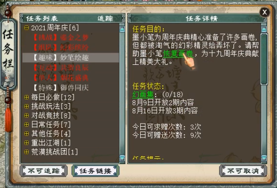 一年一度的大话周年庆又和大家见面了,不知不觉已经是大话的第十九个生日,今年周年庆的主题是绘梦韶华,在任务上做了别出心裁的设计,下面大家请随我一览今年周年庆任务的全貌。
