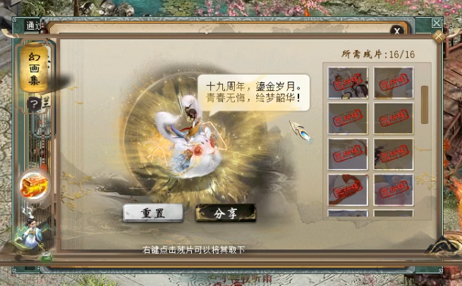3.点击合成碎片,每幅画卷需要16个碎片,合成碎片的材料在小怪和BOSS任务中掉落,每日天道酬勤也送相应的道具。