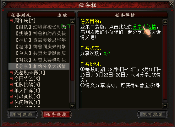为了丰富周年玩法,我们为大家准备了七个不同的项目,希望大家能够在这一次周年庆中经验多多,奖励多多,七个玩法各有特色,让你品味这一季温情周年。
